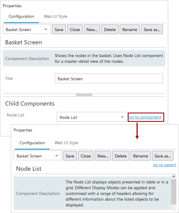 On the Basket Screen, fill in the Title parameter, and under child components, select Node List from the dropdown.