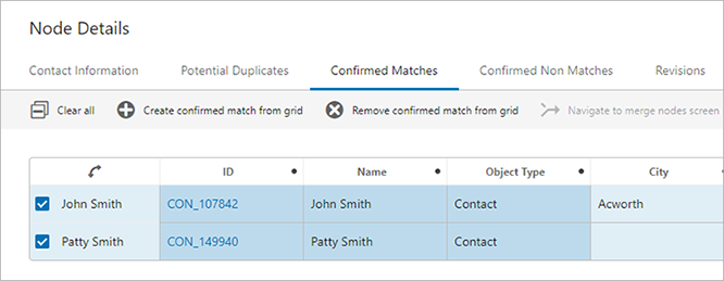 If applicable to the configuration, a merge nodes button can be added to the screen as defined in the Merging Confirmed Matches topic. To merge two matching nodes, select the relevant object from the list and click the 'Merge' (