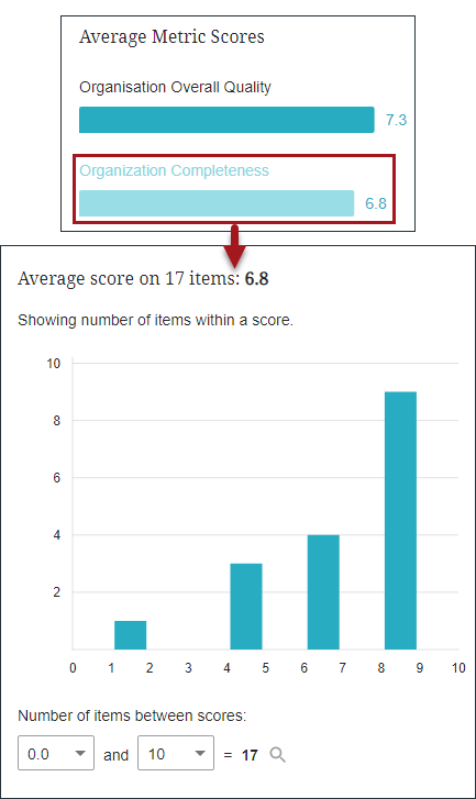 The Number of items between scores parameter can be used to view how many objects are scored within the designated range. This range can be changed via the dropdown, and once set, an advanced search can be run by clicking the magnifying glass icon (