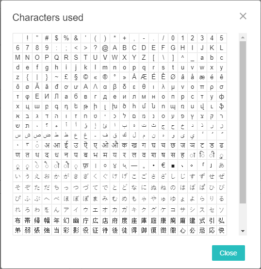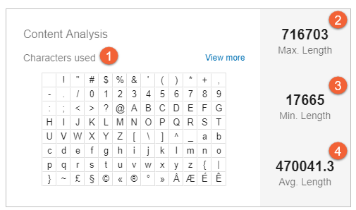 - The Characters used table indicates which characters appear within the values of the attribute. If there are too many characters to fit into the widget, click the View more link to display all characters in a separate window.