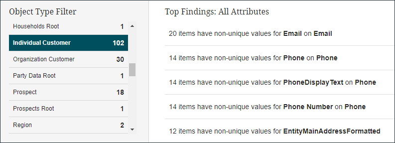 If a filter is applied to only display data for the 'Individual Customer' object type, the top findings presented on the right-hand side of the screen will only display the top findings relevant to objects of that type: