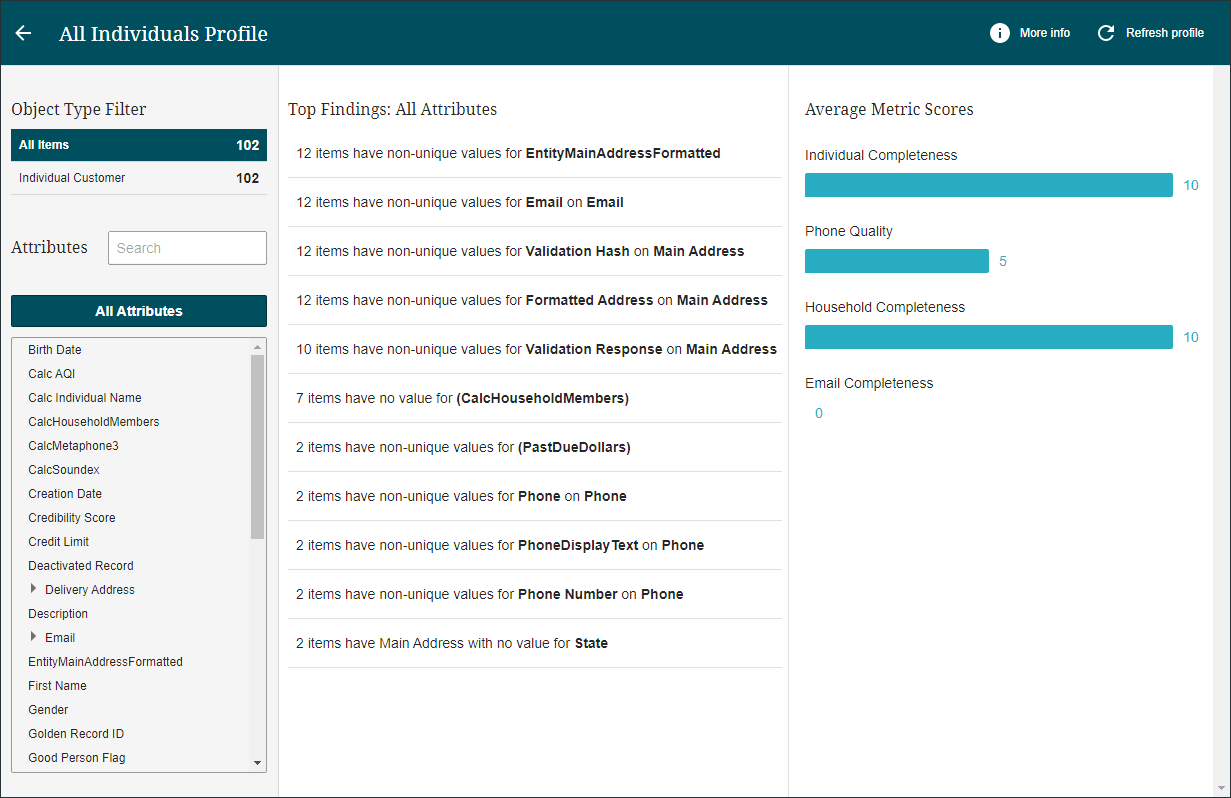 This principle also applies to other aspects of the data profile such as the Average Metric Scores and Attribute data widgets.