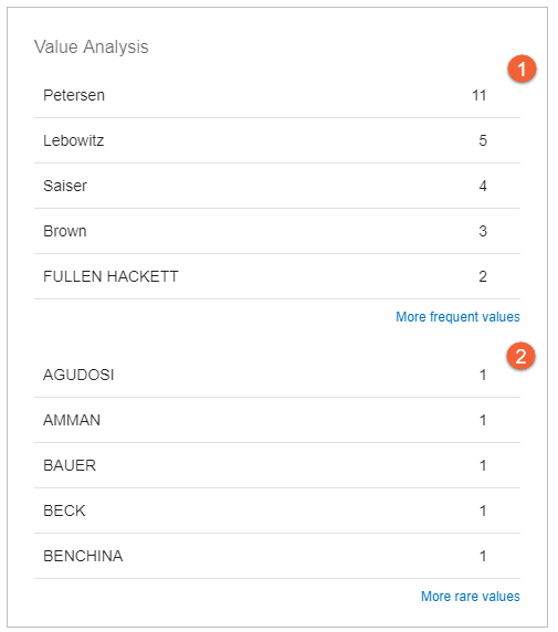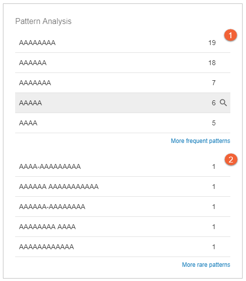 - The Rare Patterns list (appearing at the bottom of the widget) provides a list of the rarest value patterns in descending order. If there are too many patterns to fit into the widget, click the More rare patterns link to display all value patterns in a separate window.