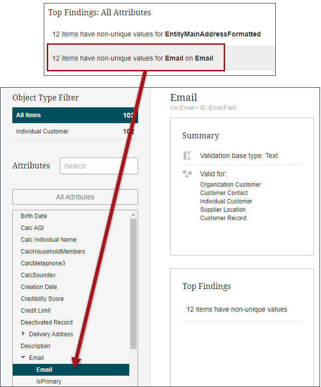 With the filter applied, the data steward can analyze the attribute data via the accompanying Attribute data widgets. Additionally, the Top Findings widget will now only display findings relevant to the attribute in question.