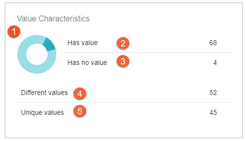 The Value Characteristics widget provides a breakdown of an attribute's values by how many objects have values for said attribute, and how many different and unique values exist, all within the context of the profile:
