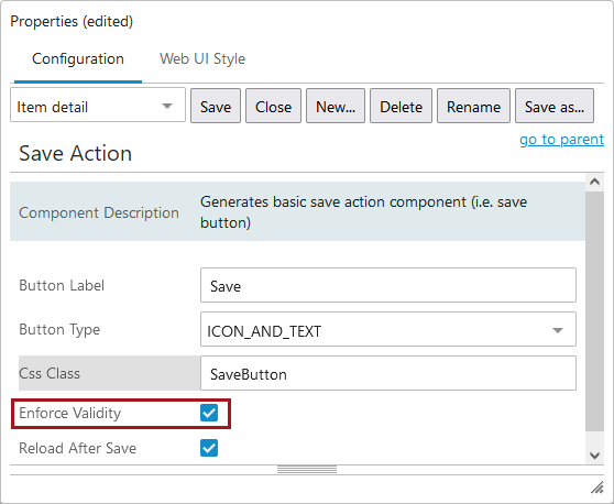To enforce that mandatory attributes are populated on the selected screen, the attributes must first be set as mandatory (as described above). In addition, any actions available on the screen that should enforce the population of mandatory attributes must have the Enforce Validity parameter selected. Typically this is applied to Save, Submit, or Approve actions. When Enforce Validity is selected on an action, the action button is not enabled until all mandatory attributes are populated.