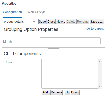 On the 'Grouping Properties' designer window, define the 'Source' attribute as described in the 'Assign a source attribute' section above. In the 'Options' field, add a new 'Grouping Option,' and double click to access. In the 'Grouping Option Properties' designer window, add the match value for the new source attribute, and then in the 'Rows' field, add the new contingent attribute(s) that will show when the match value is entered as a value for the new source attribute.