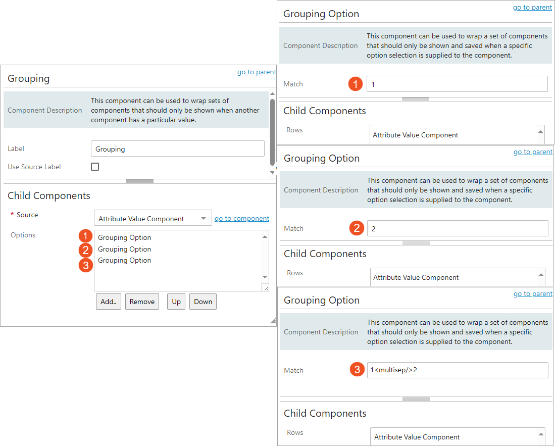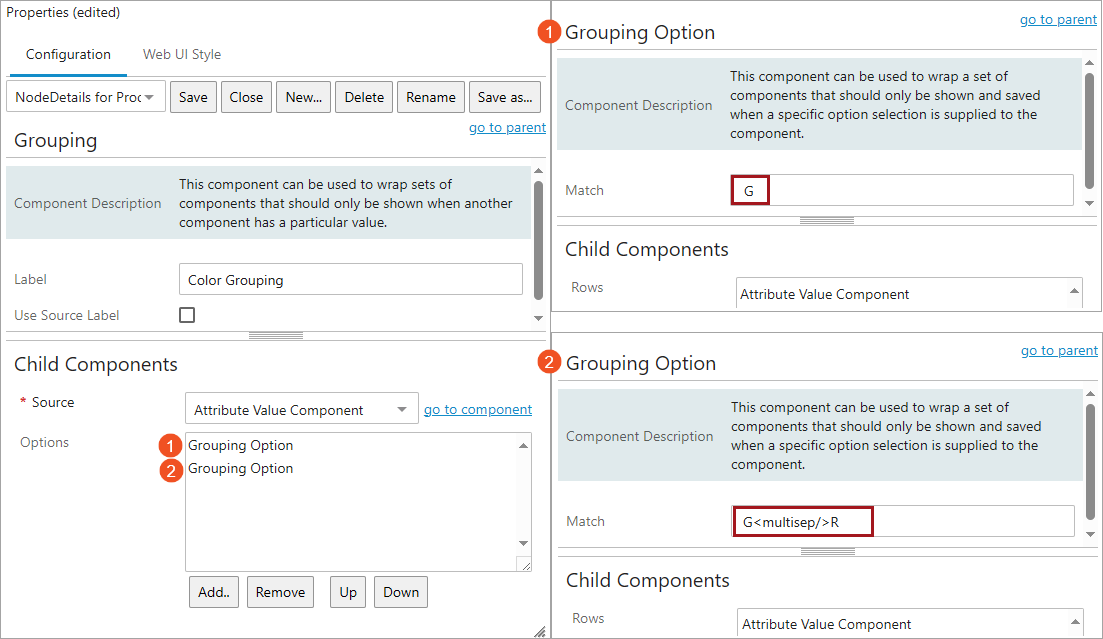 Now the Grouping Option component can be configured to define the source attribute value that, if entered, will prompt display of contingent attributes.