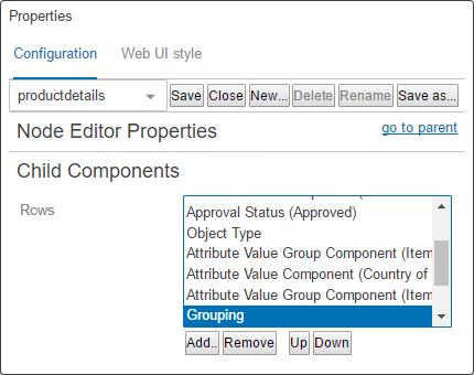 - On the Node Editor Properties designer window, under Child Components (shown in the screenshot above-left), click the Add button below the field for the 'Rows' parameter.
