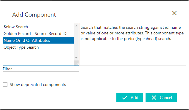 In the Edit component window, add attributes and check the box beside Search in Data Containers. Once this configuration is saved, any search initiated in the Search Widget will also search through data containers and return applicable entities within the search results.