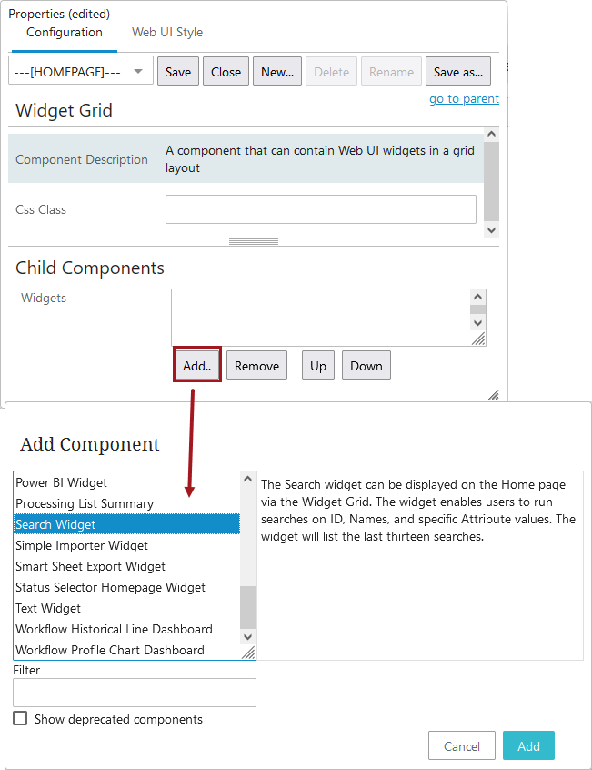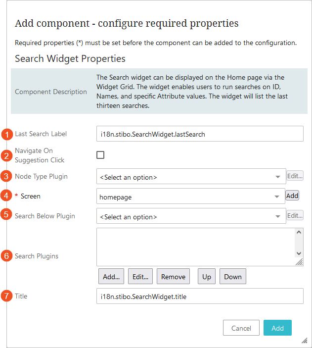 Editing the Search Widget Properties in the designer, the user must first add the 'Name Or Id Or Attributes' value in the Search Plugins field, and then click on the value to open the Edit component window.