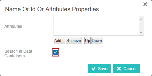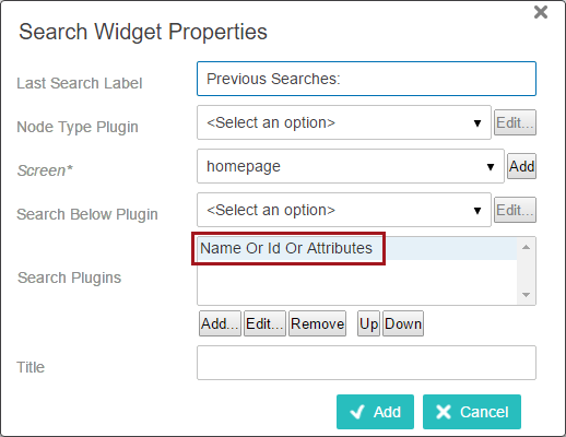 Name Or Id Or Attributes: This plugin is used to add attributes to search against. Once this search plugin is added, the user has to select the plugin and click on the ‘Edit’ button to add the attributes. This action will display the Name or Id Or Attributes Properties screen. There are two parameters that can be chosen: