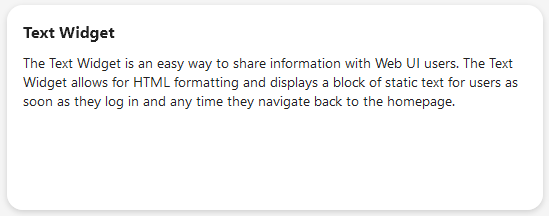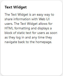 The purpose of the Text Widget is to provide an easy way to display custom text to all Web UI users. The Text Widget, which supports HTML formatting in the Text parameter, is a great way to display a custom message of welcome or next steps after logging in because it can be displayed on the homepage, where users are directed after login.