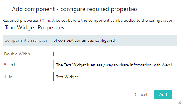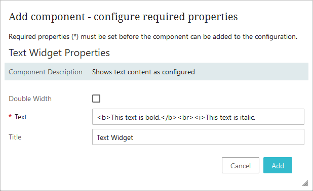 The Text parameter must be populated for the widget to be added to the homepage. When the Double Width parameter is checked, the widget can display approximately 1300 characters. When the Single Width parameter is checked, the widget can display approximately 600 characters. HTML tags can be used in the Text Widget Text parameter to display formatted text.
