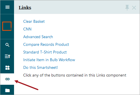 Links - Enables users to configure one of nine tasks that can be executed or initiated with the click of a button. Clicking on the Links button prompts a Links column to slide out displaying all configured tasks as text. Clicking the Links button again (or the 'X' button in the upper right-hand corner) causes the column to slide out of view.