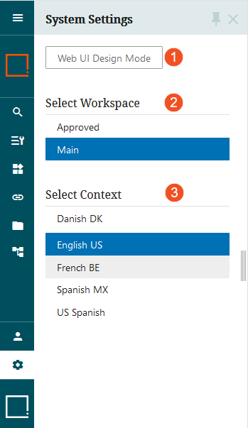 ) When clicked, the System Settings button displays a full column containing features related to accessing the designer, selecting the workspace, and selecting the context.