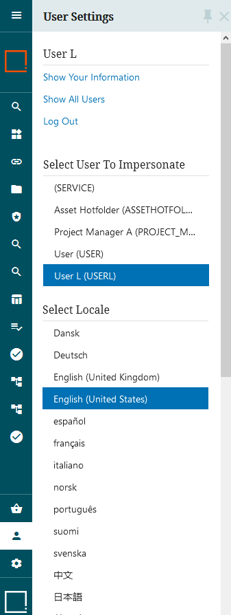 Select Locale - The logged in user can change the locale. Thirteen locales come standard with each Web UI: Danish, German, English, Spanish, French, Italian, Norwegian, Portuguese, Finnish, Swedish, Chinese (simplified), Japanese, and Korean. Depending on user settings, all locales, some locales, or no locales may be present for the user to select.
