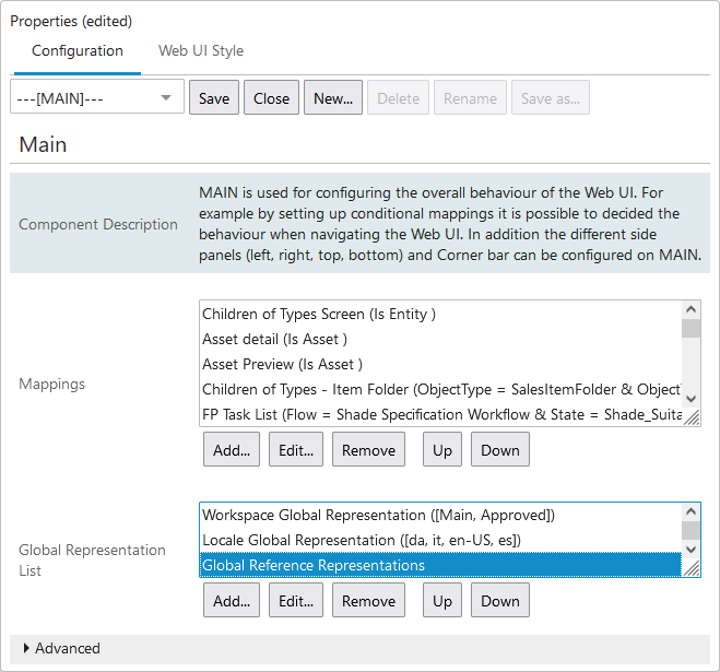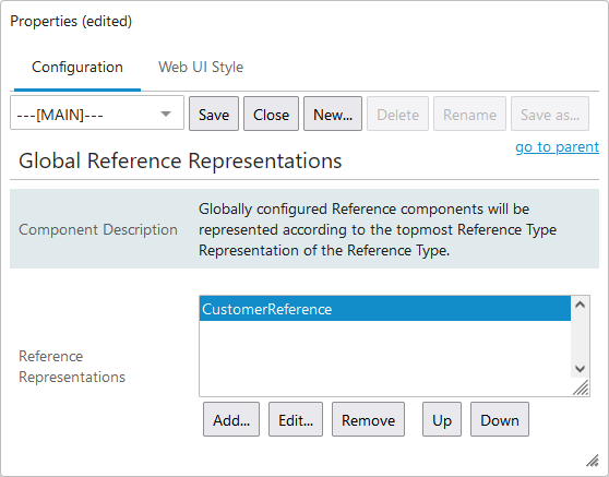 Once the component has been added to MAIN properties, any number of reference representations can be created within it. A representation is a series of configuration settings tied to a reference type. Within each representation, the relevant reference type must be specified, along with its display settings.