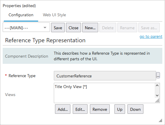 - Several different ways of displaying the specified reference type can be configured via the Views field. The view used to display the data is determined by conditions set on each view instance. If more than one view setting is valid for the specified reference type, the view that appears highest on this parameter's list is used.