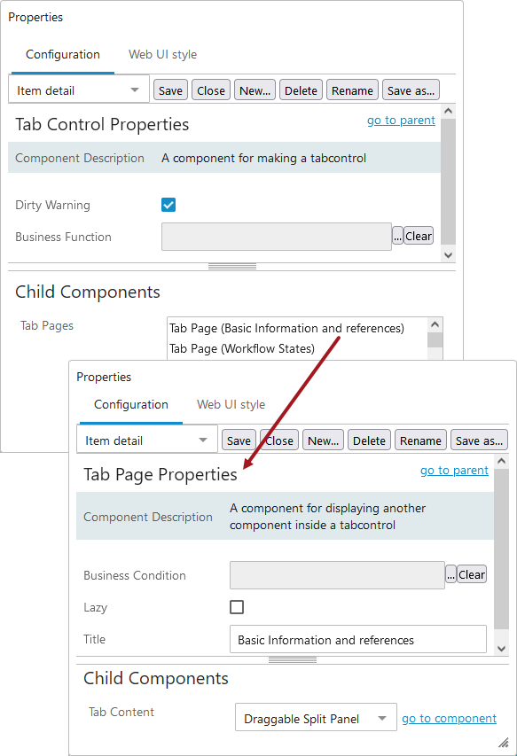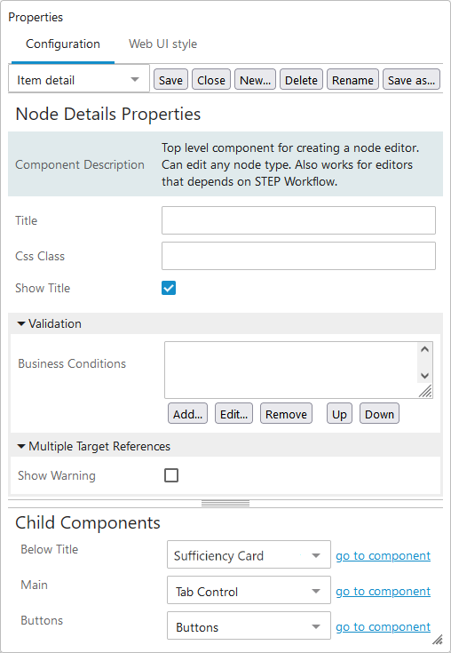 - Node Details Properties is configured as follows: Child Components > Main > Tab Control (as displayed in the screenshot under 'Child Components,' Step 1 of the 'Configuring Node Details Properties' section of this topic). For more information, refer to the Tab Pages topic.