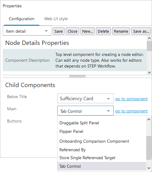 - From the dropdown menu for the Main parameter, choose a component. For example, you can add a Node Editor. Or, add a Tab Control component and configure different components and/or screens to display on different tabs all on a single Node Details screen. Additional configuration will be required depending on the selected component.