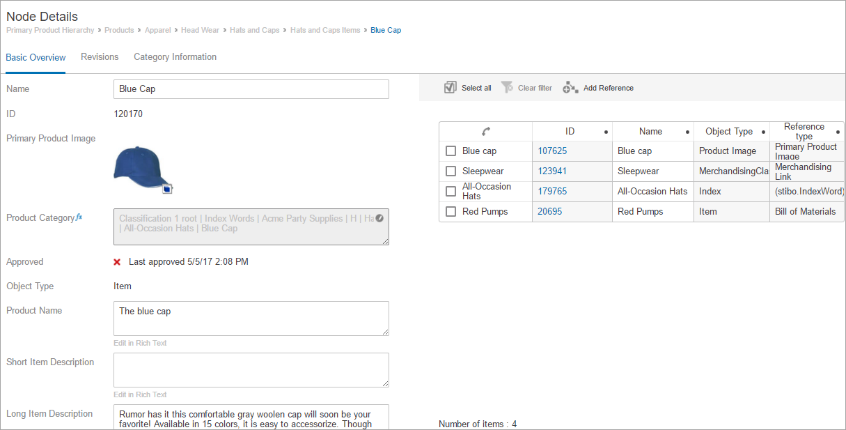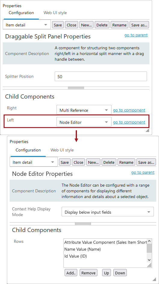 - The attributes (i.e., Name, ID, Primary Product Image) shown below are configured to display within the Node Editor component. Attribute Value and Attribute Value Group components are added within the Child Components section of the Node Editor Properties. They can be added and removed using the buttons below the Rows field, and the attribute values will display on screen based on how they are ordered within the field. They can be re-ordered using the Up and Down buttons. For more information, refer to the Node Editor Component topic.