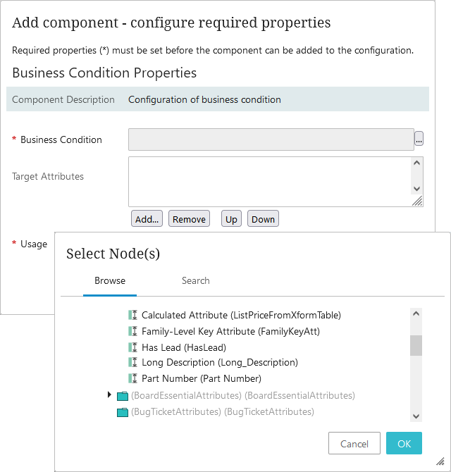 - Business Conditions: The Business Conditions field tests against values updated in the database. To add a business condition, click Add... to select an existing business condition to be executed to validate attribute values being edited on the node. Multiple business conditions can be added, but all must succeed for the process to continue. For more information about business conditions, refer to the Business Conditions topic in the Business Rules documentation.