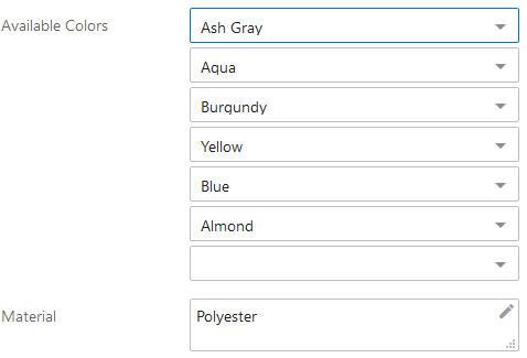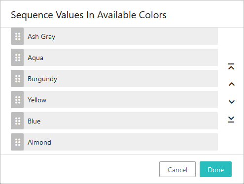 ). By clicking this icon, a 'Sequence Values' pop-up displays that allows users to change the ordering of the values. In the screenshot below, the multi-valued attribute is labeled as 'Available Colors'. The second screenshot depicts the 'Sequence Values' pop-up. The values can be re-ordered using either the drag-handles to the left of each value, or the arrow icons to the right, which can move a selected value to the top of the list (