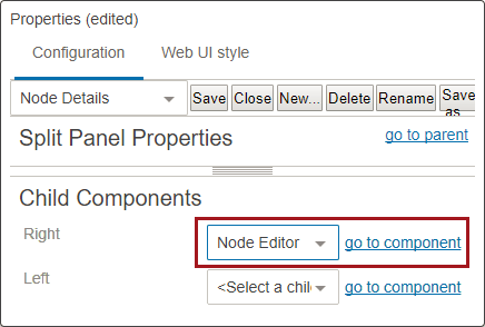 - On Split Panel Properties, select either the Right or Left field and choose Node Editor from the dropdown. Then click on go to component.