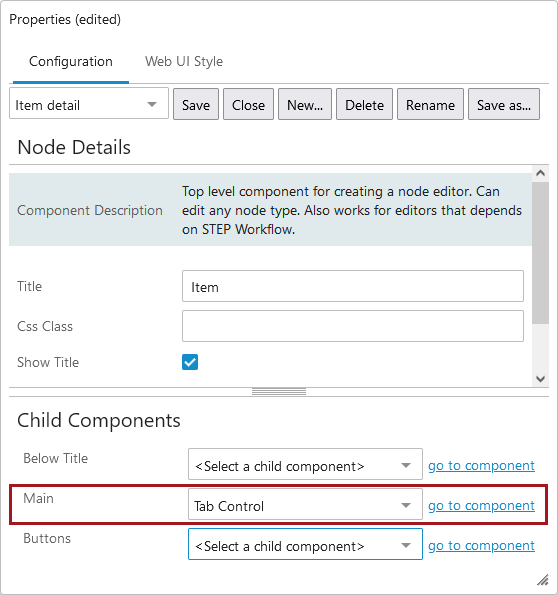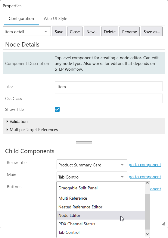 - Select a Node Details screen if it already exist, if not then create it new. Navigate to the child components section of the Node Details screen and under the Main field, select Node Editor from the dropdown.