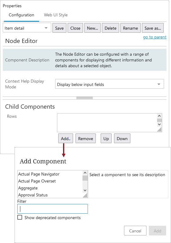 ). - Under 'Child Components', click the Add button under the 'Rows' field, and make a selection from within the 'Add component' dialog. Clicking on the component name displays a description of the component.