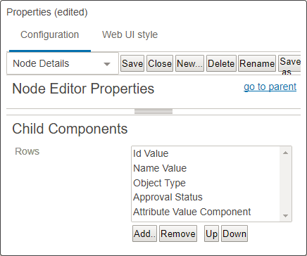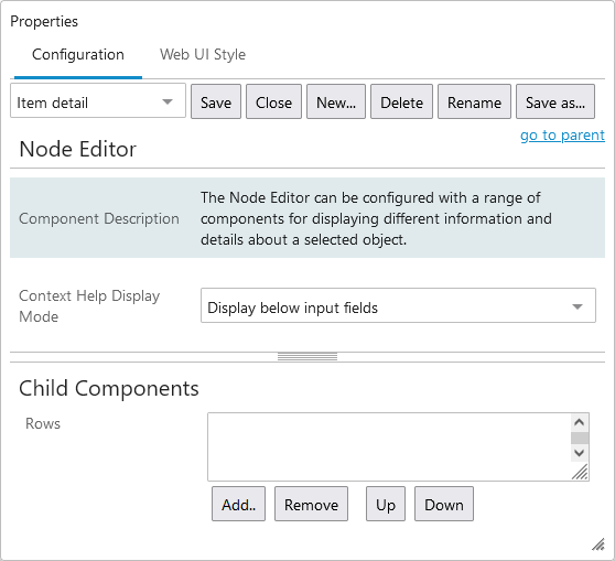 The Node Editor Properties consists of a Rows child component, which allows for the selection of various components to be used to display needed information.