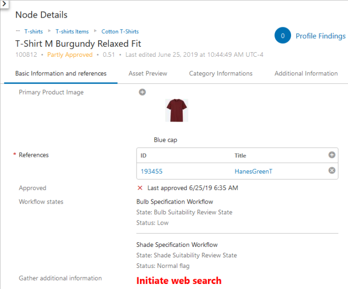 Example 1: A Node Editor configured to display sellable product information. A Summary Card component of the 'Description Card' type has been added at the top of the screen. This displays a breadcrumb (in blue text), and then the name, ID, approval status, version, and information related to when the product was last updated. Data profiling is enabled, resulting in display of the 'Profile Findings' component showing to the left of the Summary Card. Components added to the Rows field (and shown below, in order from top to bottom) are Referenced Asset Representation (which displays the thumbnail image), References, Approval Status, Workflow States, and HTML Function, which uses a business function to render HTML in the Web UI. In this example, HTML Function enables a web search to gather additional information about the product.