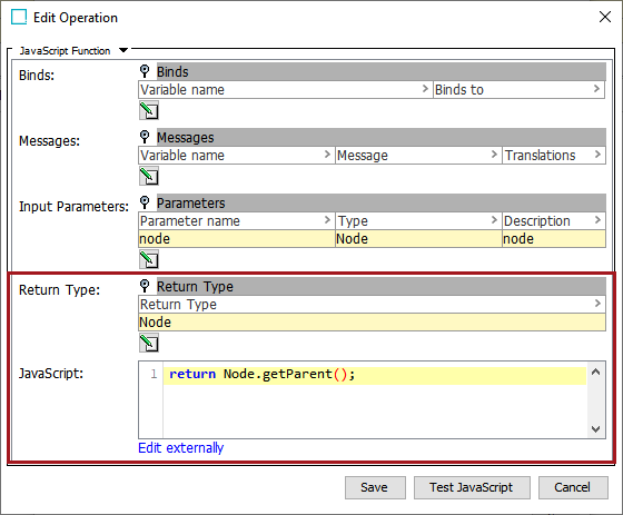 • Select a business function for the 'Node Selector Function' written in JavaScript that has a Return Type of 'Node.'
