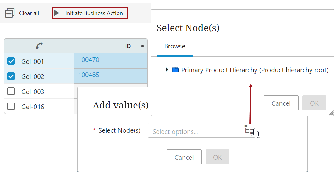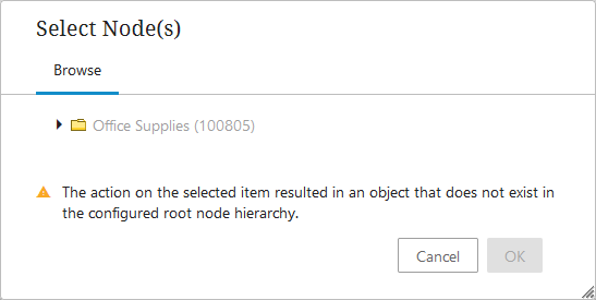If the business function configured in the Node Picker Dialog returns a node that does not exist in the static root node hierarchy, a warning message displays, and the user can manually navigate to the desired node.