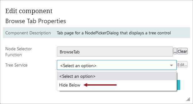 2. In the Browse Tab Properties window that appears, select Hide Below from the dropdown, and click Edit.