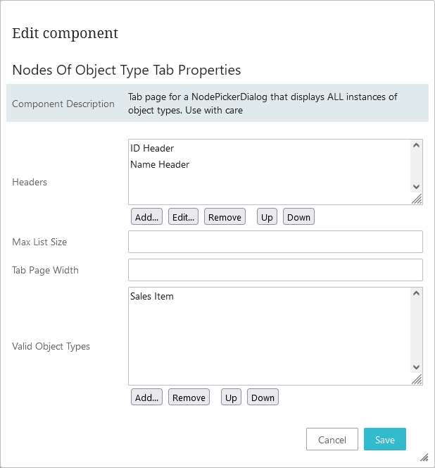 • Headers: This parameter is used to organize the node list with configurable headers. To add a header, click Add and select a header component.