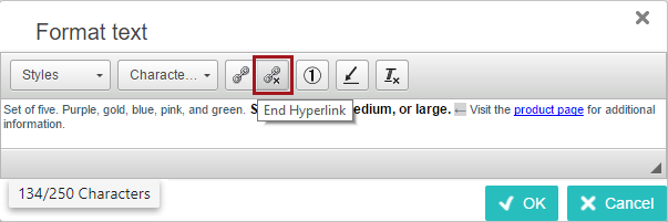 The 'End Hyperlink' icon activates when you click anywhere within hyperlinked text. Click the icon to remove the applicable hyperlink.