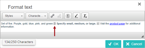 To insert a character tag, place your cursor within the text exactly where you want the character tag to display. Then, click the Character tag dropdown and make a selection. Character tags appear with a gray background within the 'Format text' dialog and within the attribute value field.