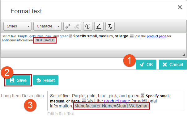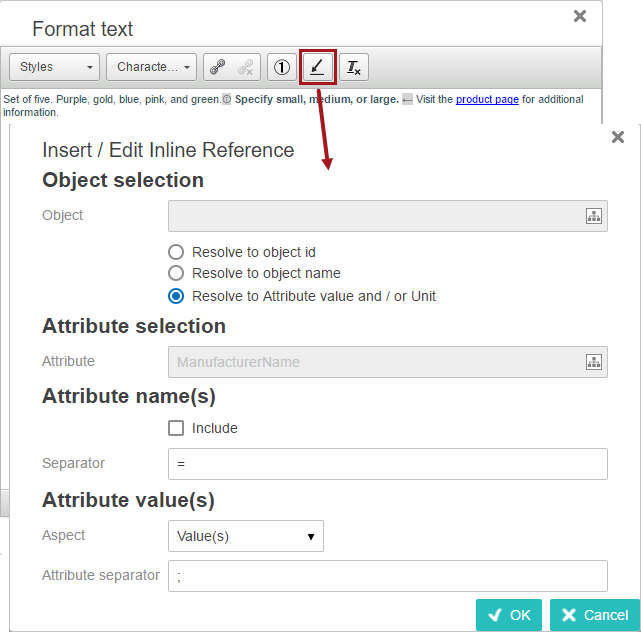 1. Once you click OK, the 'Format text' editor will show the inline reference as '[NOT SAVED].' You will need to click OK on the text editor and then save the data before it will display in the value field. The attribute must be valid for the object type, otherwise the inline reference disappears from the value field upon save.