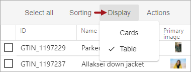 'Display' allows you to change the arrangement of information using a card layout or a table layout, which is the default display. Both layouts follow the selections made in the 'Define view' option (accessible from the Search Configuration button) to determine the information displayed and the 'Sorting' options determine the order of the data.