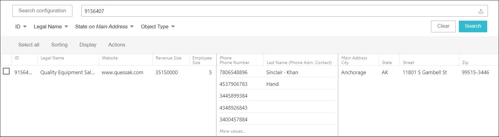 When displaying multi-instance data containers, individual values will be listed in the associated attribute column as extra rows. If an attribute has more than 5 values for an object, the text 'More values...' will appear in the last row. To view these additional values, click on the object in the table to navigate to its details screen. Data container reference values appear in the same row as the associated data container attribute value being referenced. When displaying multi-reference values, the extra values appear beside each other in the same cell, separated by a dot.