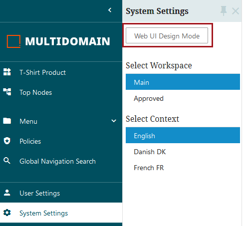 2. Click the design mode launch button icon found on the Global Navigation Panel. Navigate to the System Settings section, and click on the 'Web UI Design Mode' button.