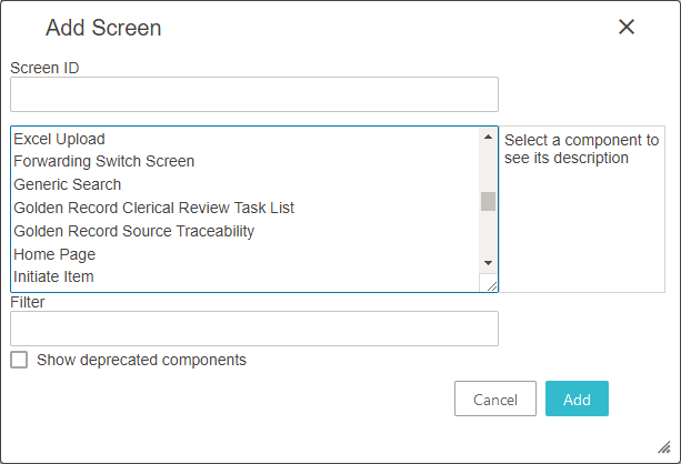 Note: When the 'Show deprecated components' checkbox is checked, the withdrawn or deleted components will be listed within the screen type list. Using any of these deprecated components will prompt the Web UI user with an error.