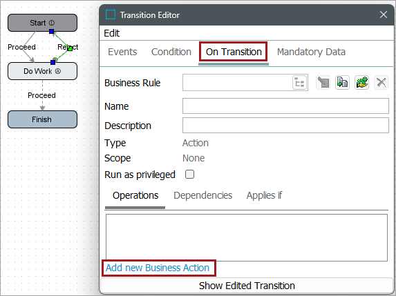 Right-click on the transition that should be recorded, select Edit Transition, click on the On Transition tab, and click the Add new Business Action link.