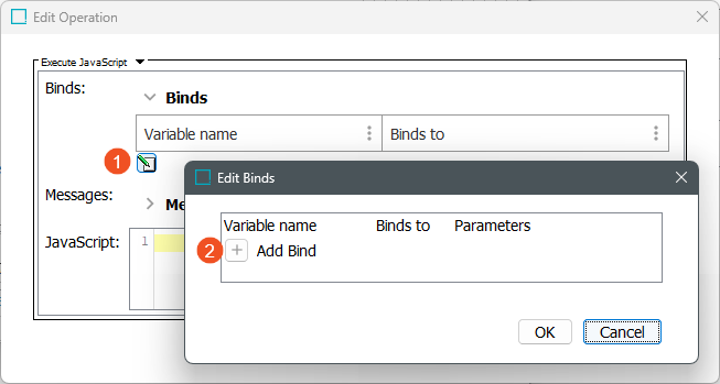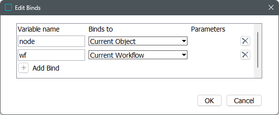 1. For this example, we need to bind to both current object and current workflow. Input variable names and select the appropriate binds, as shown below. Click OK to close the Edit Binds dialog when complete.