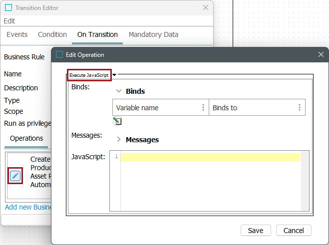 1. Click on the Edit icon button that appears under the Operations tab. This will bring up the Edit Operation dialog. Select the Execute JavaScript dropdown option.