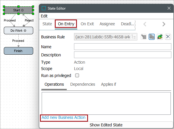 Right-click on the state and select Edit State. Click on the On Entry tab, and click the Add new Business Action link.