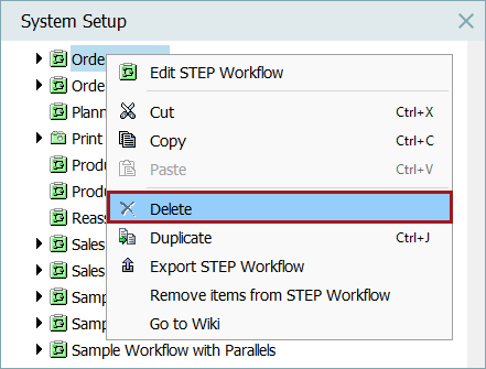 To delete an entire workflow, right-click on it from the System Setup tab and select Delete.