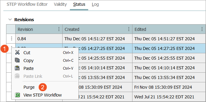 To purge a revision, right-click on the row indicator (>) next to the desired revision and select Purge.